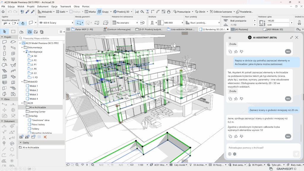 Graphisoft systematycznie rozwija wbudowane narzędzia SI. Wprowadzony w wersji 29 Asystent SI odpowiada na pytania o obsługę Archicada, zasady modelowania i przepisy (obecnie w zakresie lokalnych przepisów brytyjskich), a także umożliwia zaznaczanie elementów w modelu na podstawie wybranych kryteriów. Planowane jest sukcesywne rozwijanie tego narzędzia w kierunku pogłębionej interakcji użytkownika z programem oraz wykonywania złożonych działań edycji i kontroli modelu. Celem jest bardziej intuicyjna obsługa i automatyzacja kluczowych zadań związanych z jakością i spójnością informacji.