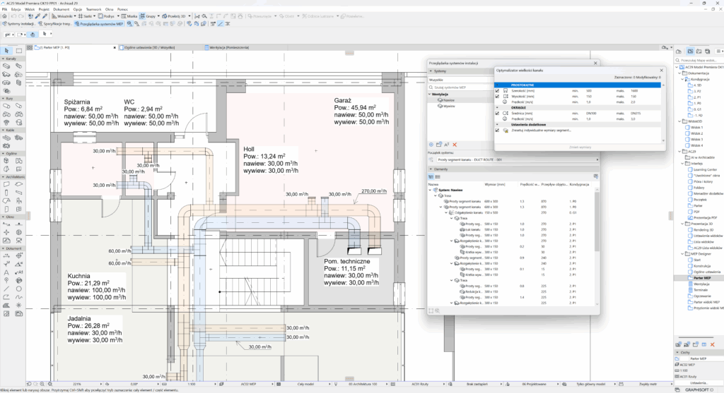 W nowej wersji Archicada sukcesywnie rozwijane są narzędzia MEP, wyraźnie wzmacniając projektowanie wielobranżowe. W zakresie wentylacji projektanci mogą definiować wymagania wymian powietrza dla pomieszczeń i weryfikować ich spełnienie na etapie modelowania kanałów wentylacyjnych. W przeglądarce systemów MEP dodano możliwość definiowania systemów hydraulicznych wraz z parametryzacją i analizą przepływów – po zdefiniowaniu warunków pracy instalacji możliwa jest optymalizacja wymiarów elementów systemu.