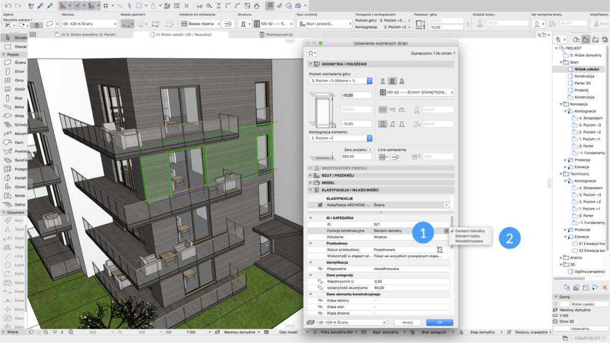 Na rysunku przedstawione zostały dostępne opcje w tym zakresie. Prawidłowe zdefiniowanie funkcji konstrukcyjnej umożliwia skorzystanie z tej informacji do filtrowania modelu na rysunkach 2D i w widoku 3D lub użycia wariantów graficznych np. do wyświetlenie schematu konstrukcji budynku.