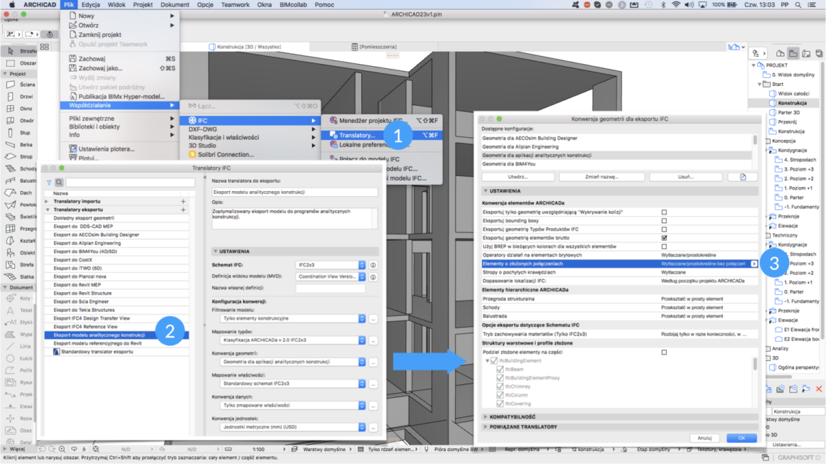 Do wyboru sposobu eksportu służą translatory IFC. Szczegółowe zasady konfiguracji poszczególnych funkcji dostępne są w pomocy programu ARHCICAD.
