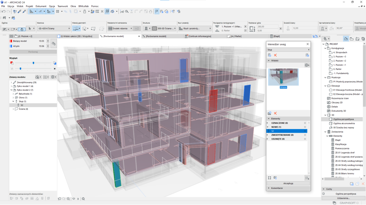 Ciekawym rozwiązaniem jest możliwość porównywania modeli. Wprowadzony mechanizm jest niezależny od dostępnej wcześniej możliwości wykrywania zmian w modelach IFC i wczytania do projektu różnic pomiędzy nimi. W przypadku modeli w programie Archicad zakres możliwości się poszerza. Porównywanie dotyczy nie tylko zmian wprowadzanych w czasie pracy, ale również widoków 3D tego samego modelu co może być wykorzystane do oceny różnic pomiędzy proponowanymi wariantami projektu.