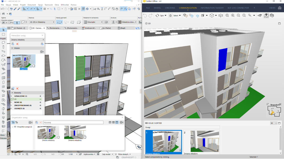 Konieczność współpracy w ramach różnych (niezależnie rozwijających się) platform oprogramowania wymusiła podążanie za rozwojem standardów wymiany modeli i komunikacji międzybranżowej. Wdrożenie w programie Archicad rozwiązań obsługi uwag do modelu i możliwość ich eksportu i importu w formacie BCF 2.1 poprawiło wymianę informacji pomiędzy członkami wielobranżowego zespołu projektowego likwidując wiele niedogodności wynikających z wcześniejszych wersji.